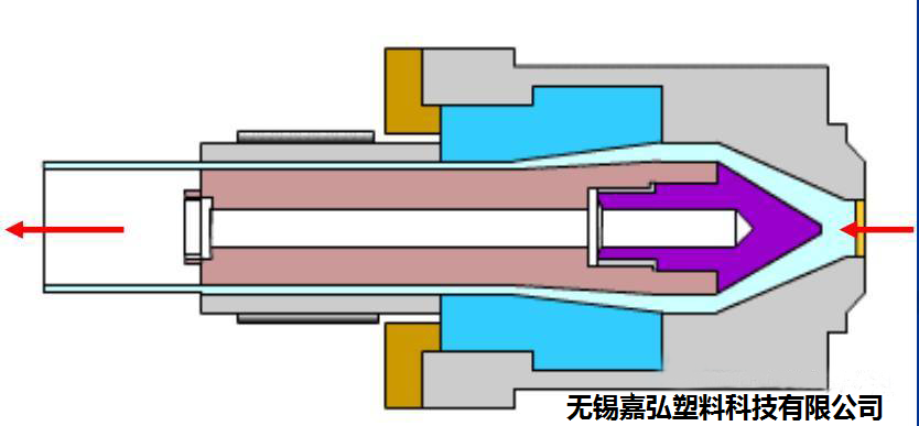機頭的成型部分的設計應保證物料擠出后具有規定的斷面形狀,由于塑料的物理性能和壓力、溫度等因素的影響,機頭的成型部分的斷面形狀并非就是制品的相應的斷面形狀,二者有相當的差異,設計時應考慮此因素,使成型部分有合理的斷面形狀。由于制品斷面形狀的變化與成型時間有關,因此控制必要的成型長度是一個有效的方法。