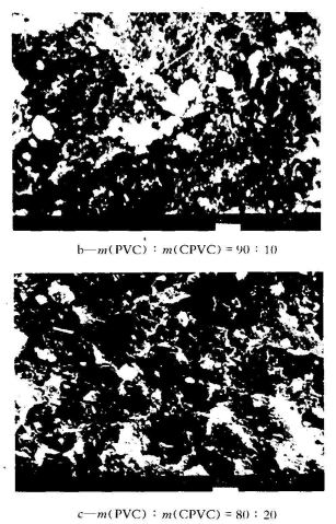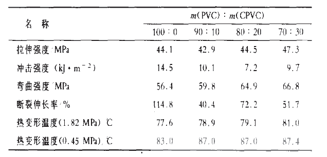 結(jié)果表明,在有機(jī)錫穩(wěn)定劑的作用下,當(dāng) (PVC): (CPVC)從1O0:0向70:30變化時,隨著CPVC含量的增多,pvc/CPVC二元合金體系的拉伸強(qiáng)度、沖擊強(qiáng)度、斷裂伸長率均呈現(xiàn)先下降后上升的趨勢;而彎曲強(qiáng)度卻與之相反,出現(xiàn)先上升后下降的趨勢。兩種趨勢在(PVC):(CPVC)=80:20時出現(xiàn)拐點,此時體系的沖擊強(qiáng)度和斷裂伸長率都下降到單用PVC時的50% ,拉伸強(qiáng)度也只有原來的93%,而彎曲強(qiáng)度卻提高了5%。除此之外,隨著共混比中CPVC含量的增加,體系的熱變形溫度不斷升高,(PVC):(CPVC)=70:30時,在不同彎曲正應(yīng)力(1.82MPa和0.45 MPa)下,熱變形溫度較PVC分別增加1.3 ℃ 和5.6℃。