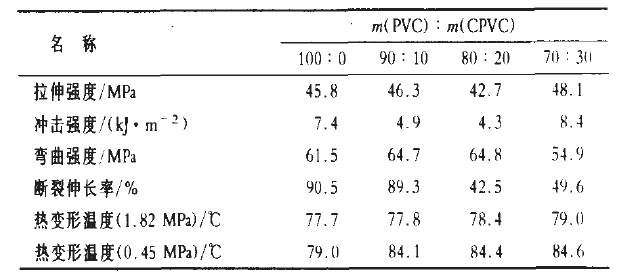 實驗中較早先選擇鉛鹽穩(wěn)定劑,探討共混比對PVC/CPVC二元合金性能的影響,結(jié)果見表1。