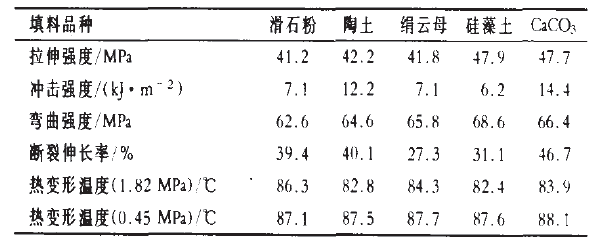 從表3可以看出:PVC/CPVC合金體系的拉伸強(qiáng)度以選用硅藻土和活性CaCO3時較大,分別為47.9MPa和47.7 MPa,沖擊強(qiáng)度則是選用活性CaCO~和陶土?xí)r較大,分別為14.4 kJ/m2和12.2 kJ/m2。在采用活性CaCO3時,試樣的斷裂伸長率也達(dá)到較大,為46.7%。由于填料的使用量小,填料品種對PVC/CPVC合金體系的彎曲強(qiáng)度和熱變形溫度影響不大。